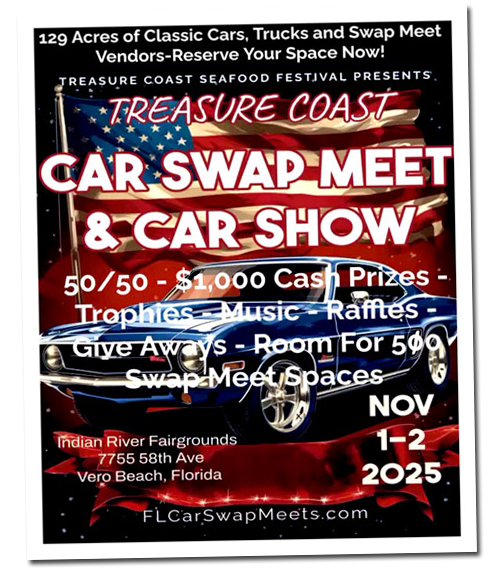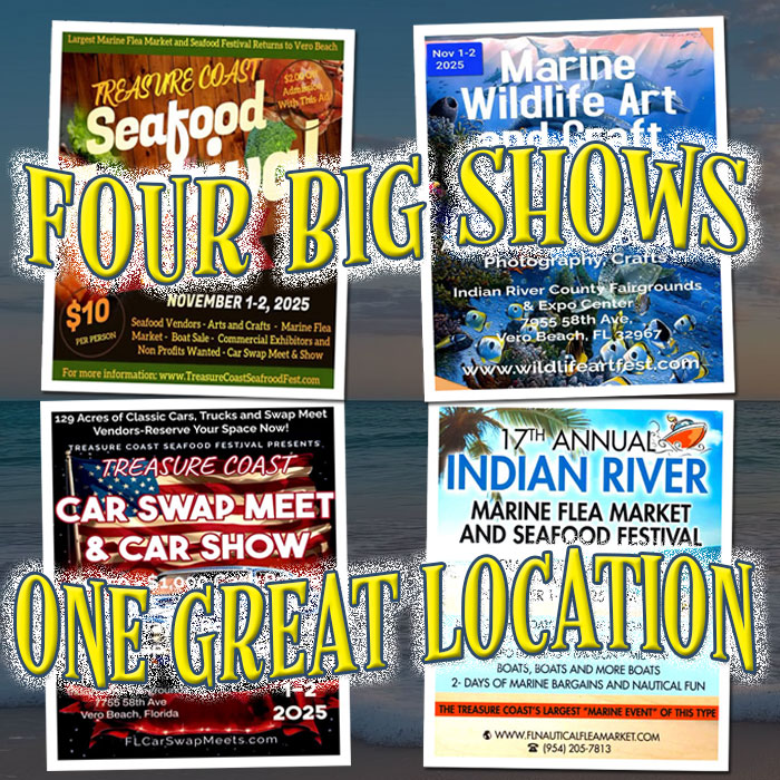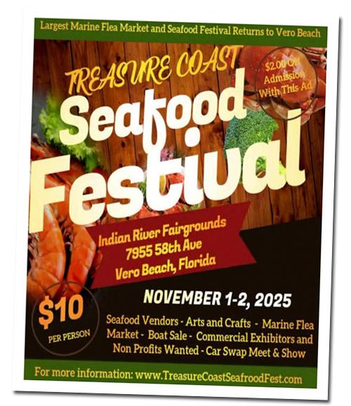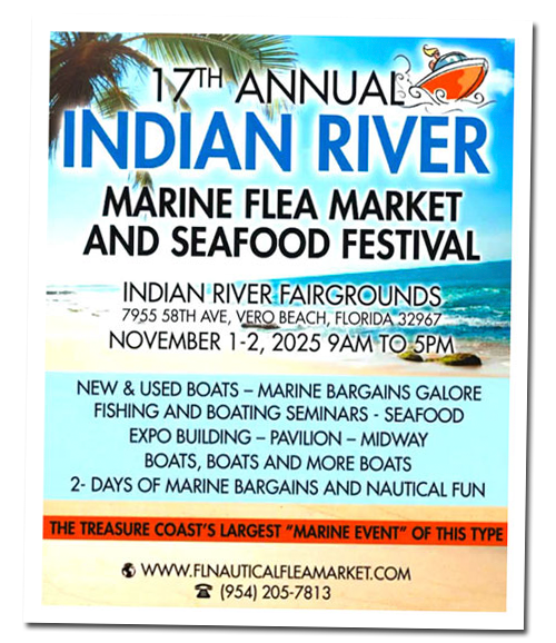 Last Chance For 2 x 1 Inside Space Don't miss the 17th Annual Indian River Marine Flea Market and Seafood Festival, happening November 1-2, 2025, from 9 AM to 5 PM at the Indian River Fairgrounds in Vero Beach, FL. FLNauticalFleaMarket.com
